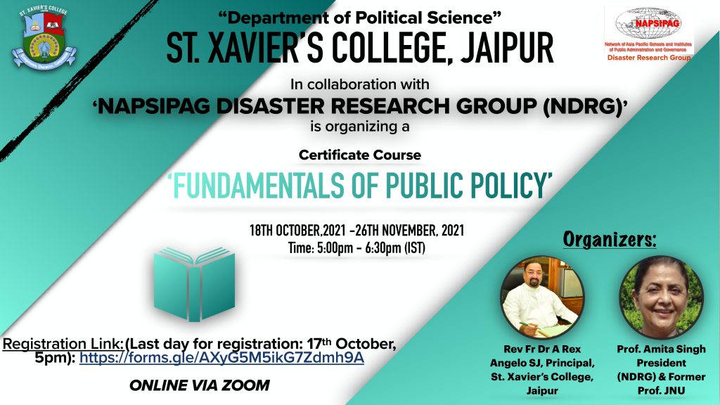 NAPSIPAG disaster Research Group in collaboration with St. Xavier’s College, Jaipur is organizing a Certificate Course on Fundamentals of Public Policy. The key objective of this certificate course is to deepen students’ understanding of the way in which public policy is made. The course will cover both theoretical and practical aspects of public policy. The course will be held online and is open for UG students.